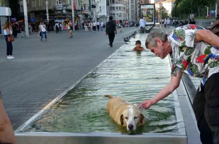 İstanbul Taksim Meydanı'nda bunaltıcı sıcak hava nedeniyle bir çocuk ve bir köpek süs havuzuna...