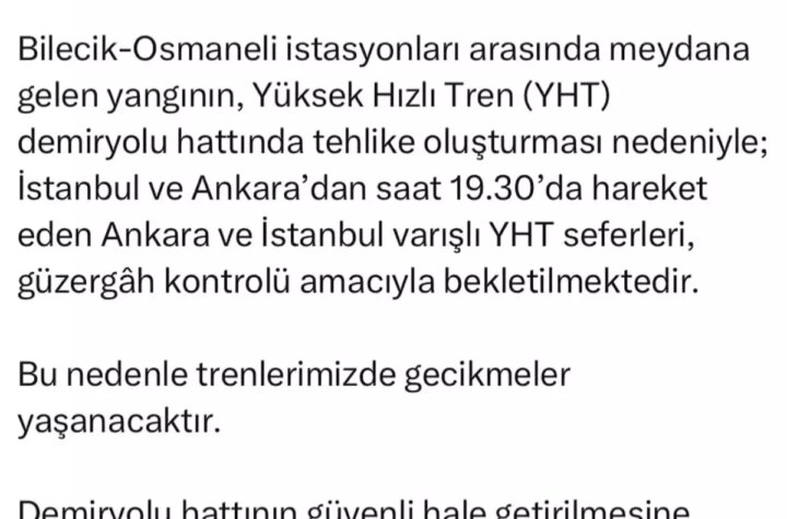 Bilecik'in Osmaneli ilçesinde süren orman yangını, İstanbul-Ankara süratli tren seferlerini olumsuz etkileyerek gecikmelere neden...