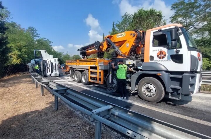 Sakarya'nın Akyazı ilçesinde devrilen tır nedeniyle Anadolu Otoyolu'nda trafik durma noktasına geldi. Olay yerinde...