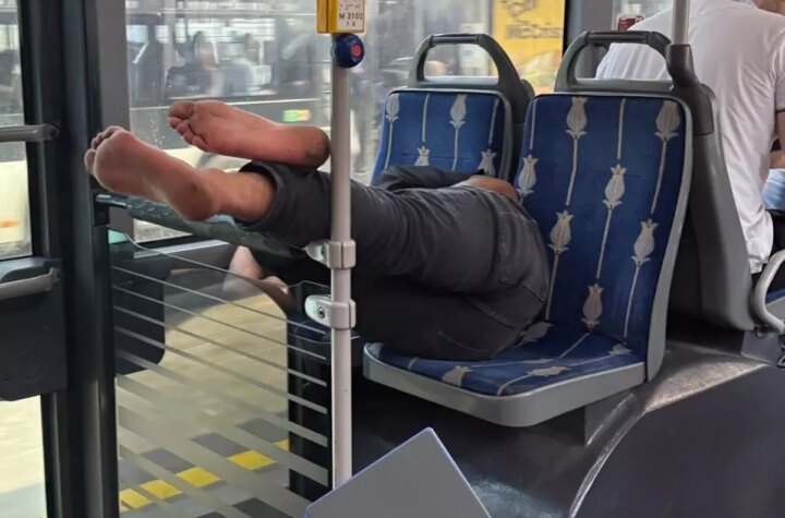 İstanbul'da bir metrobüste terliklerini çıkarıp çıplak ayaklarını yan koltuğa uzatan bir yolcu, uyumaya çalışarak...