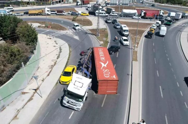 Arnavutköy'de kömür yüklü bir tır, dönüş yaptığı esnada konteynerinin devrilmesi sonucu kaza yaptı. Talih...